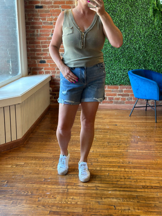 KanCan | High Rise Roll Up Distressed Dark Wash Shorts
